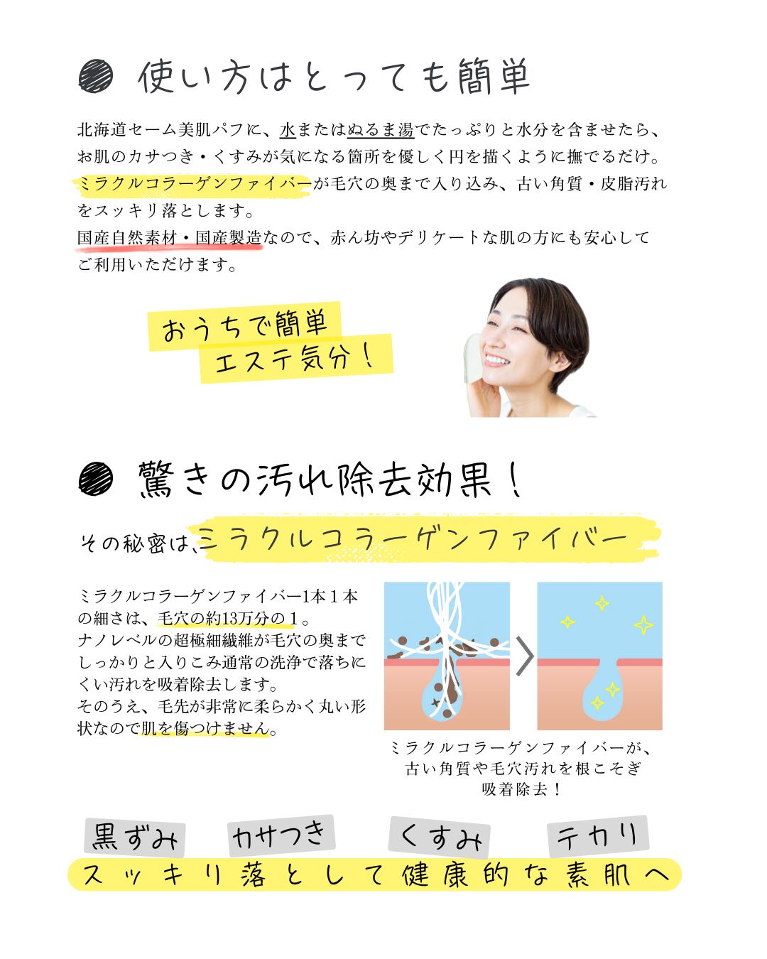 天然のミラクルコラーゲンファイバーが毛穴の奥まで入り込んで古い角質・毛穴汚れをしっかりと吸着除去します。